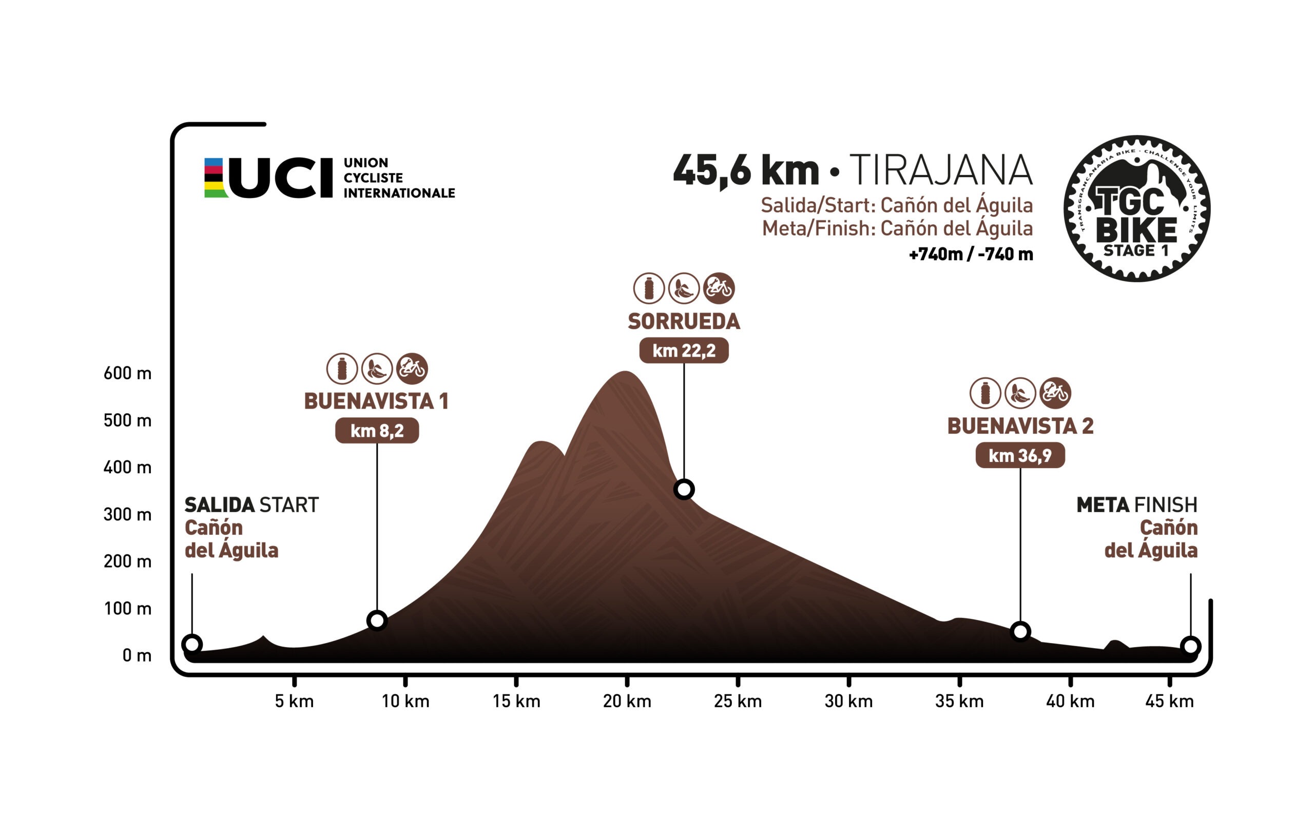 9:30 h: Primera etapa – Cañón del Águila – Cañón del Águila | 45,6 kms y 740m de desnivel.