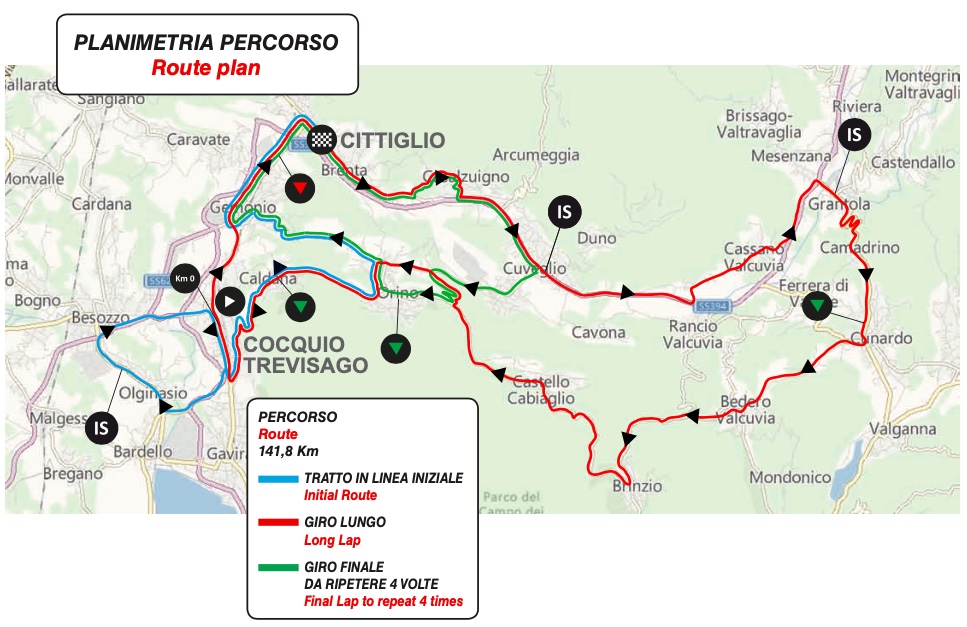 Por lo tanto, un pelotón completo entró en los últimos cuatro pasos por el circuito local alrededor de Cittiglio, meta de la segunda clásica WWT tras Strade Bianche. Estas vueltas locales, de 17,6 kilómetros cada una, y se caracterizan por las ascensiones a Via Sciareda (0,8 km al 8,4%), la Chiesa Nuova di San Vittore y el Orino (3,1 km al 4,4%). Un segundo intento de ataque de Rooijakkers tuvo más éxito. Ella y Tatiana Guderzo mantuvieron medio minuto de ventaja.