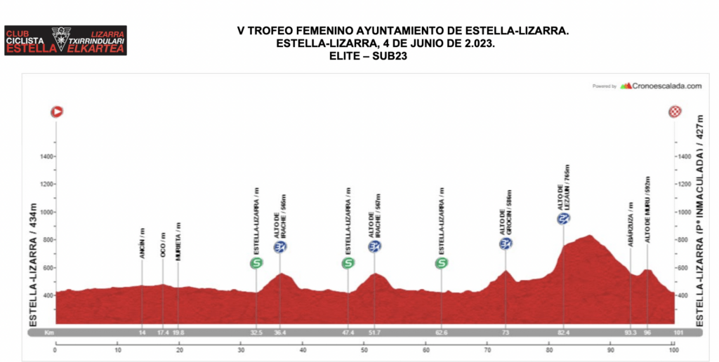 Para ver a las Élite-Sub23 habrá que esperar a la jornada dominical, cuando las deportistas emprendan el itinerario de 101,9 kilómetros propuesto desde la organización del Club Ciclista Estella. Este trayecto es similar al establecido para las junior, pero con una variante que incorpora una última escalada a Lezáun por un puerto de segunda categoría antes de afrontar el camino de retorno al punto de inicio.