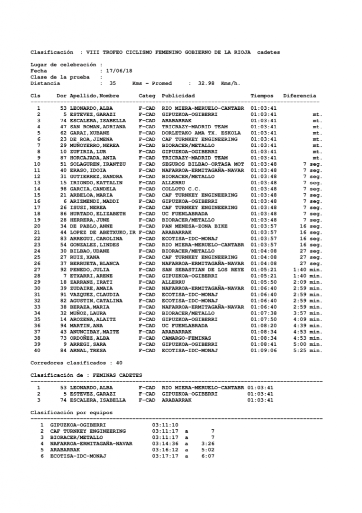Finalmente, la carrera cadete, de 35 kms, en el que el pelotón ha rodado agrupado, no dejando que las escapadas pudieran llevarse a cabo a pesar de todos los intentos realizados por las corredoras del equipo Rio Miera – Meruelo. Muy activas desde el inicio de la competición. Finalmente, ha tenido fruto su insistencia puesto que la vencedora ha resultado, Alba Leonardo al sprint, precisamente, la mas activa durante la carrera.