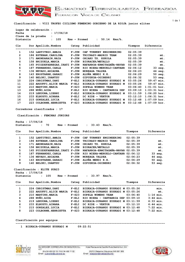 La prueba júnior, de 70 kms, que han corrido junto a las élite, enlazaba en el kilómetro 35 de la prueba élite, rodando junto al pelotón de las mayores a partir de ese punto. Igual que en la prueba élite, las juveniles, empezaban a mover la carrera a falta de 20 kilómetros, donde se ha formado un grupo de nueve corredoras, que han llegado a la meta situada en Entrena, donde se han jugado la victoria al sprint, que ha recaído en la alavesa, Amaia Lartitegi.