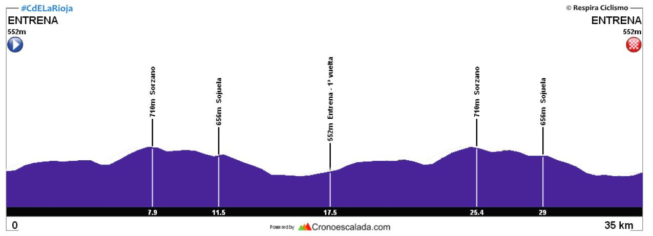 El recorrido de la prueba se desarrollará sobre un total de 105 kilómetros en un circuito entre Entrena, Sorzuano y Sojuela al que las cadetes darán dos vueltas (35 kms.), a partir de las 9.45 h. Las élite comenzarán a las 11.15 para dar seis giros (105 kms.), incorporándose las júnior en el segundo, por lo que darán cuatro vueltas (70 kms.). La dureza del trazado se evidencia en el desnivel, 1.600 metros en el caso de las élite, destacando una rampa final que servirá para marcar diferencias en meta.