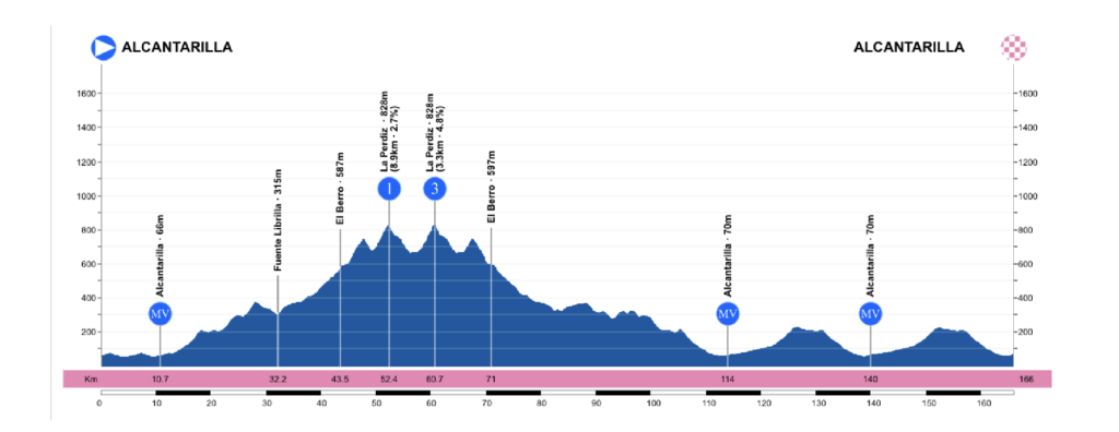 Los primeros 11 Kms se realizan en un circuito urbano al que se le dan dos vueltas, con meta volante en la segunda (Km.10). A continuación el pelotón marchará hacia Sierra Espuña (El Berro), por Barqueros y Fuente Librilla, subiendo en dos ocasiones el Alto de la Perdiz, la primera vez como puerto de 1ª y la segunda ocasión, de 3ª categoría, para volver por el mismo recorrido hacia Alcantarilla, donde se disputará la segunda meta volante (Km. 114). Se iniciarán aquí dos vueltas a un circuito de 26 Kms, de modo que en el primer paso por Alcantarilla tendremos la última meta volante de la jornada (Km. 140) y en el siguiente estará situada la meta (Km. 166).