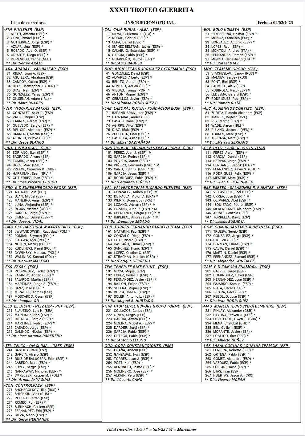Los ciclistas inscritos © Trofeo Guerrita