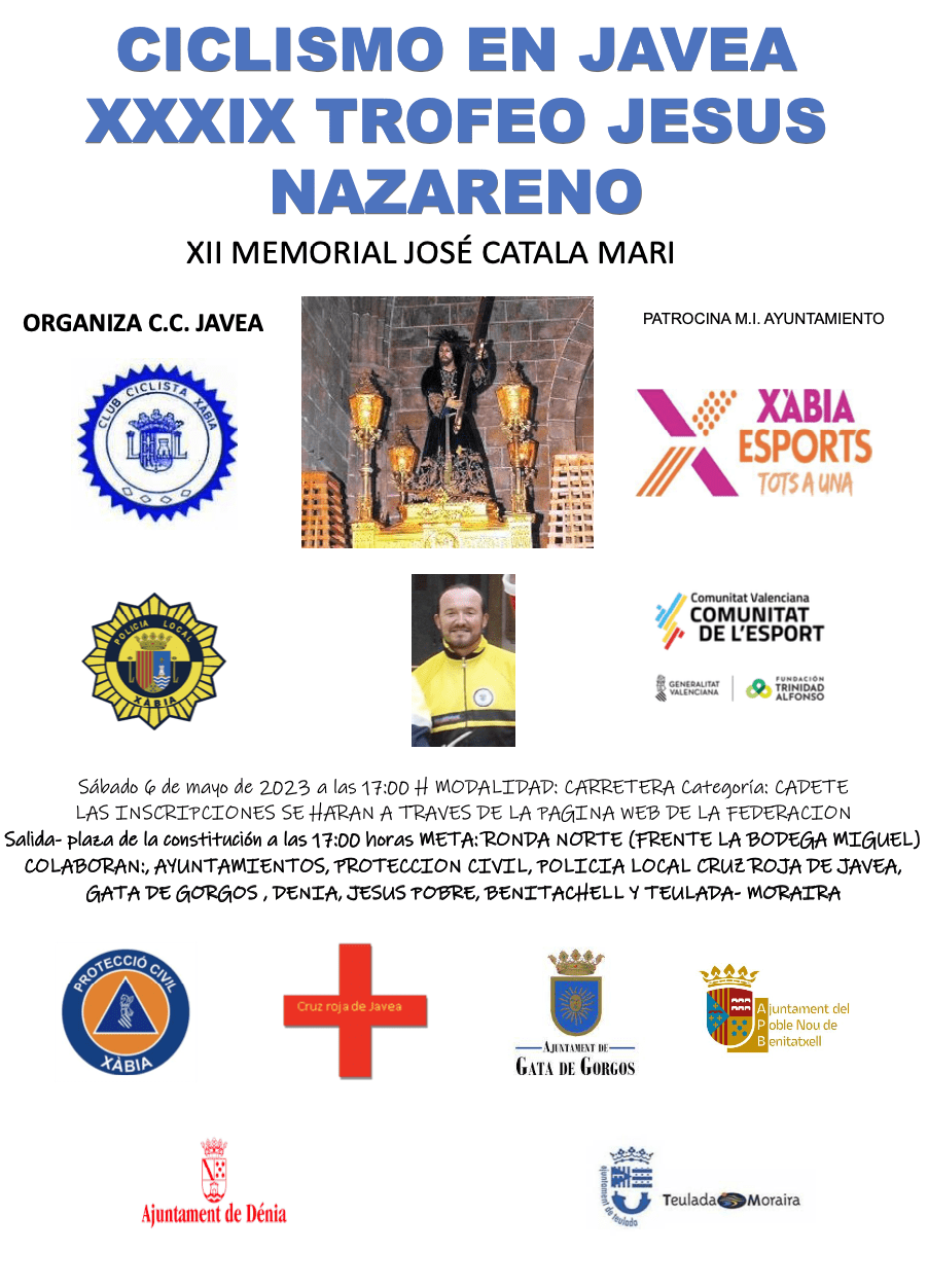 El próximo día 6 de mayo el ciclismo de base vuelve a la localidad alicantina de Xàbia (Alicante) con la 39ª edición del Trofeo Jesús Nazareno-12º Memorial José Catalá Marí– para las categorías de cadetes y féminas júnior, prueba puntuable para la Challenge de Cadetes Ruta de la Comunitat Valenciana.