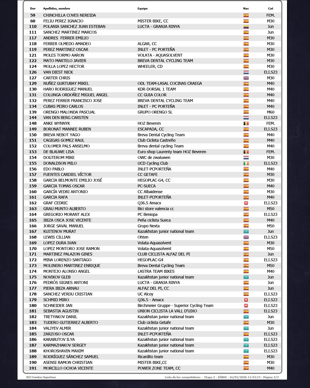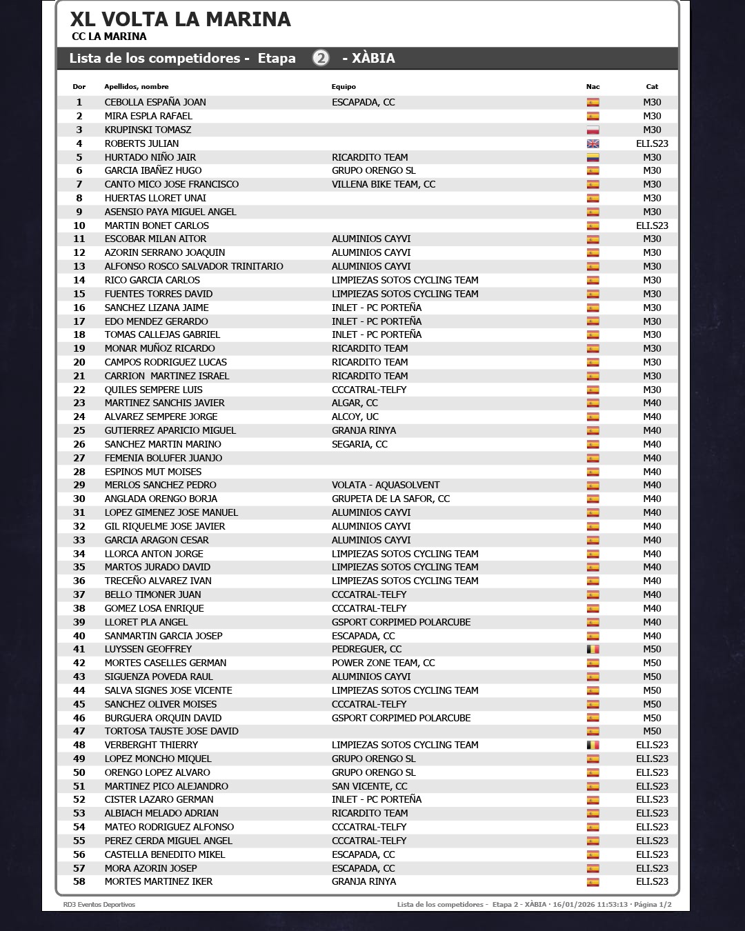 El próximo sábado 17 de enero se celebrará en la localidad alicantina de Xàbia la segunda prueba puntuable de la Volta La Marina 2026 que comenzará a las 11 horas sobre un recorrido de 66 kilómetros (4 vueltas a un circuito). El Trofeo Sant Sebastià, organizado por el CC Jávea, servirá para seguir definiendo los mejores ciclistas de una competición que arranca en Teulada.