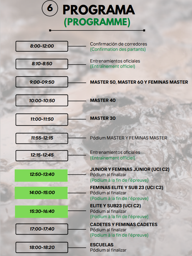 El domingo 1 de octubre, la competición la iniciarán las categorías máster 50, máster 60 y máster féminas a las 9:00 h., seguidos de los máster 40 a las 10:00 h. y los máster 30 partirán una hora más tarde. Por su parte, la categoría junior tomará la salida a las 12:50 h., mientras que las élite-sub23 lo harán a las 14:00 h. y sus homólogos masculinos a las 15:30 h. La categoría cadete será la encargada de cerrar la prueba a las 17:00 h. en este Complejo Deportivo Las Mestas de Gijón.
