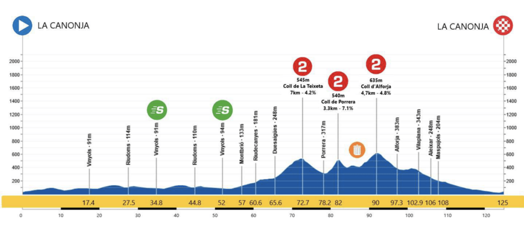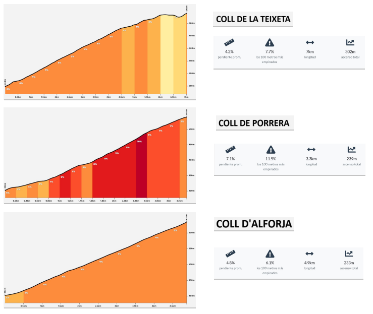 Tras este primer bucle más urbano, los ciclistas se dirigirán hacia el interior, camino de un encadenado de tres puertos de segunda categoría, comenzando con el Coll de la Teixeta (7 km al 4,2%), que se supera en el kilómetro 60 de carrera. Posteriormente, se subirá al Coll de Porrera (3,3 km al 7,1%) y al Coll d’Alforja (4,7 km al 4,8%), coronándose este último a 33 kilómetros de meta. A partir de ahí, terreno nuevamente favorable al paso por los municipios de Alforja, Vilaplana, Aleixar y Maspujols, hasta la meta final en La Canonja.