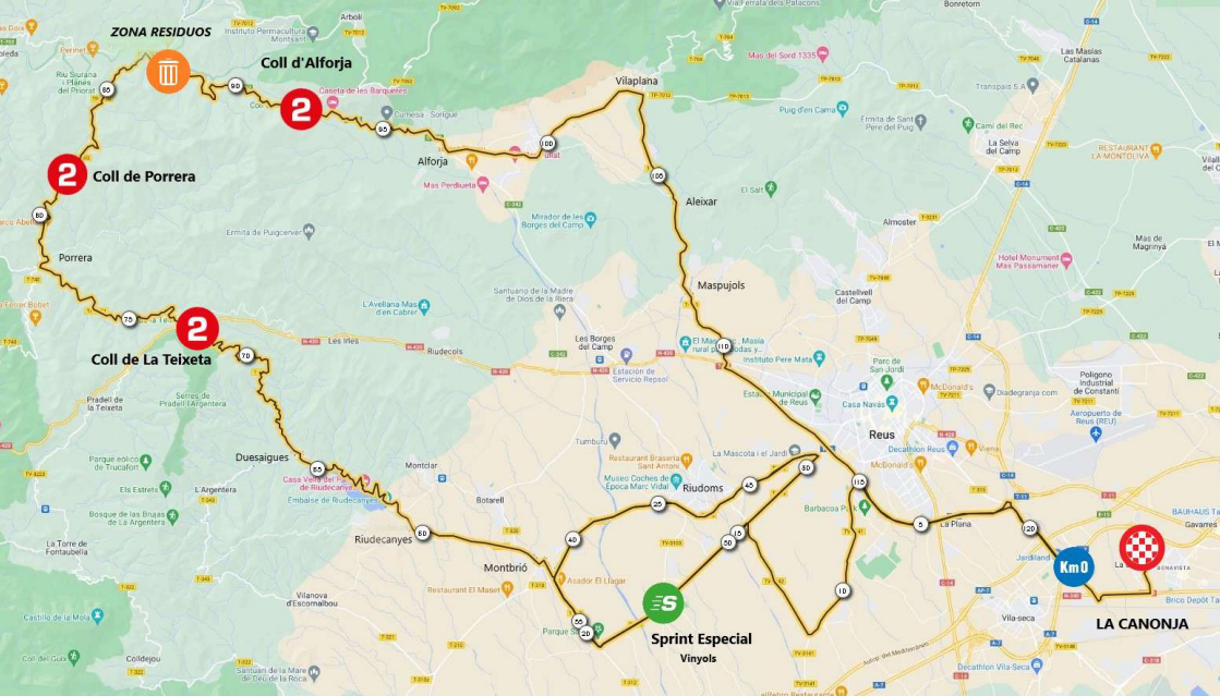 La prueba tarraconense, que tendrá salida y meta en la localidad de La Canonja, propone un trazado quebrado de 113 kilómetros que, comenzará con una primera hora de carrera de perfil llano, atravesando las localildades de Riudoms, Montbrió, Vinyols, Riudecanyes y Duesaigües.