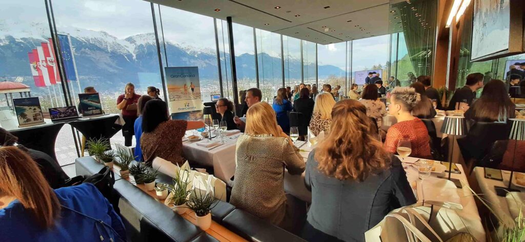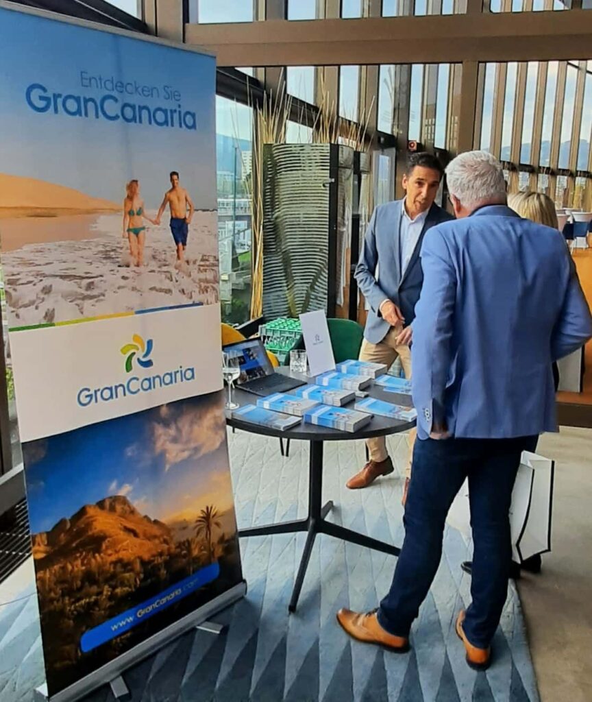 Posteriormente, a través de una dinámica entrevista con el moderador Ronny Blaha, se han puesto de relieve las posibilidades de Gran Canaria como destino ideal para hacer turismo activo y deportivo, especialmente en el ámbito del senderismo y las rutas en bicicleta. También se han dado a conocer los detalles de grandes eventos deportivos internacionales como el Gran Canaria Walking Festival, la Gran Canaria Bike Week o la Transgrancanaria. Como hitos de los últimos años, se destacó el Paisaje Cultural de Risco Caído y las Montañas Sagradas de Gran Canaria declarado Patrimonio Mundial por la Unesco; así como el sello que también se concede a través de este organismo internacional como Destino Turístico Starlight, así como lugares de visitas en excursiones menos conocidos como las Salinas de Tenefé, el Museo del Plátano o la Finca La Laja con su café de Agaete.