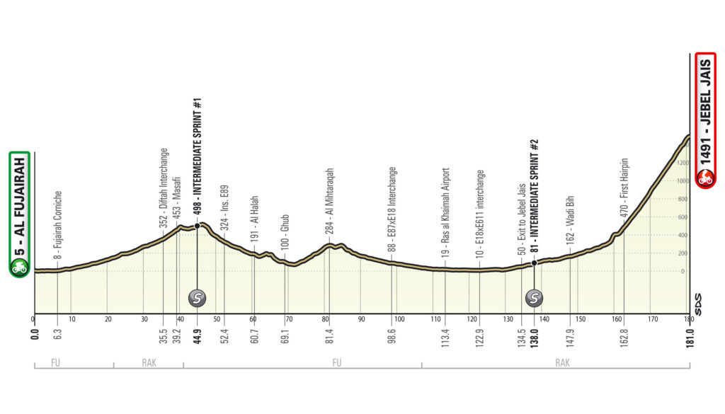 Esta es la primera de las dos etapas de montaña probablemente decisivas. Está dividida en dos partes bien diferenciadas: la primera es una aproximación ondulada a la montaña final a través del desierto y la segunda son los últimos 20 km más o menos de subida continua hasta la meta. La salida es desde Fujairah, atravesando las zonas desérticas al borde de las montañas Hajar hacia Ras-al-Khaimah, cuya capital no es atravesada por la carrera, que se dirige directamente hacia la montaña Jebel Jais. La subida final de la etapa tiene una longitud de unos 20 km a un 5% casi constante, con pendientes ligeramente más pronunciadas de alrededor del 7% en los últimos 2 km.