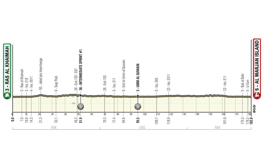 La etapa comienza en Ras-al-Khaimah para cruzar el desierto después de la salida. A los pies de Jebel Jais se dirige luego a Umm al Quwain y al norte para cruzar de nuevo el desierto y llegar casi a Ras al Khaimah antes de dirigirse a la isla Marjan para el sprint final. Todo el recorrido transcurre por carreteras anchas, bien pavimentadas y esencialmente rectas a través del desierto, donde el viento y a veces la arena pueden afectar al pelotón.