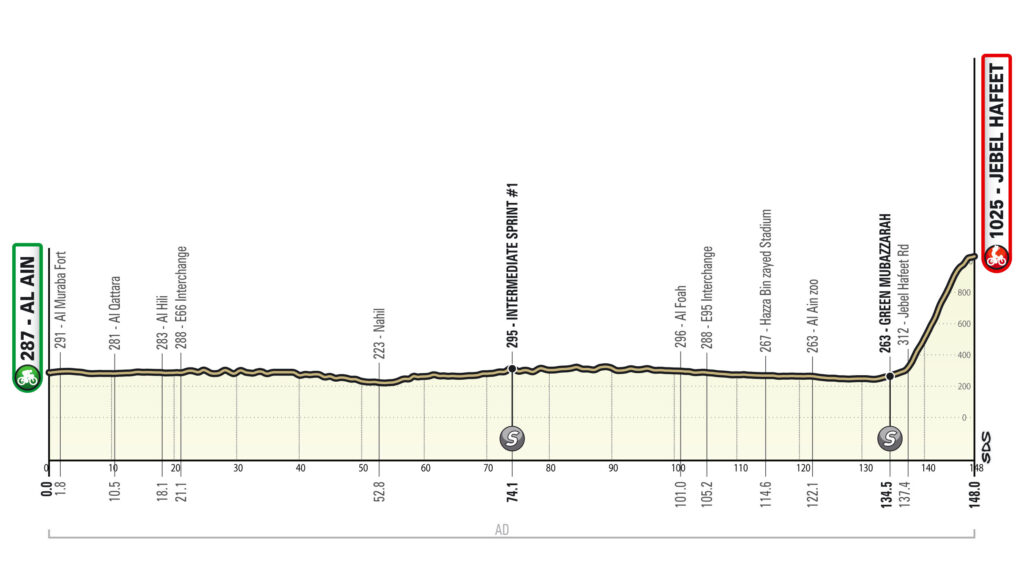 Esta es la clásica etapa de montaña de la prueba. La primera parte de la etapa sigue la ruta habitual alrededor de Al Ain, pasando por muchos de sus conocidos lugares de interés (el zoo de Al Ain, Al Qattara, Al Hili, el oasis de Al Ain) antes de volver, tras un largo bucle en el desierto, a Green Mubazzarah, donde la subida final de 10 km a Jebel Hafeet es el «juez» final de la carrera. Una subida final que serpentea a lo largo de amplias curvas en una carretera de 3 carriles. Las pendientes son en su mayoría del 8-9%, con un pico del 11% a 3 km de la meta. Hay una bajada muy corta en el último km antes de la última rampa (todo en asfalto).