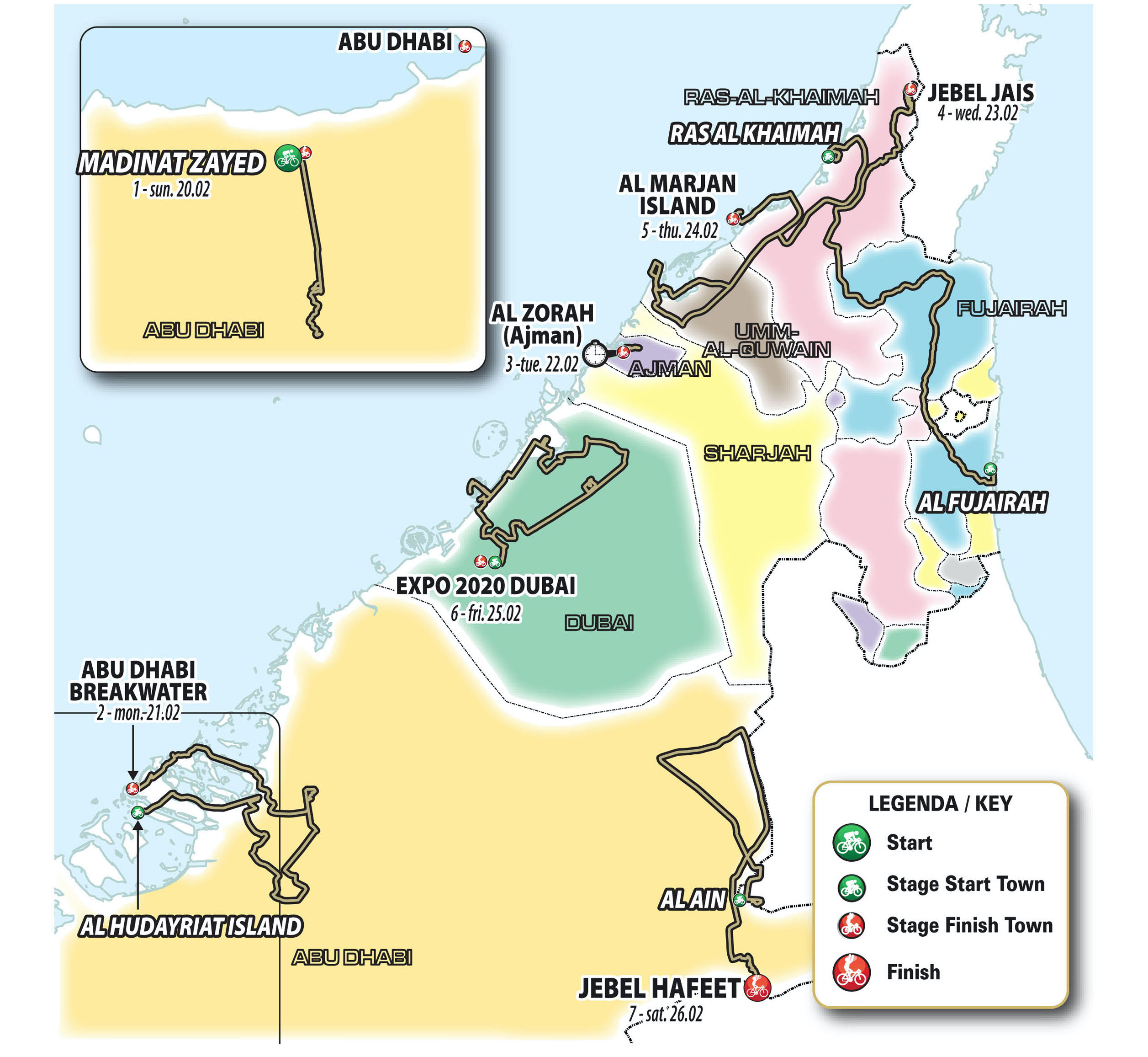 Etapa alrededor de la ciudad de Abu Dhabi. Sale de la isla de Hudayriat y discurre en su primera parte por Abu Dhabi para llegar al puente Sheikh Zayed y luego a la ciudad de Khalifa. Después de la mitad del recorrido en Al Wathba Camel Track, la ruta pasa por Al Falah para converger en Yas Marina y dirigirse a la isla de Saadiyat y a la Corniche antes de llegar al rompeolas de Abu Dhabi, donde se espera un sprint del pelotón.