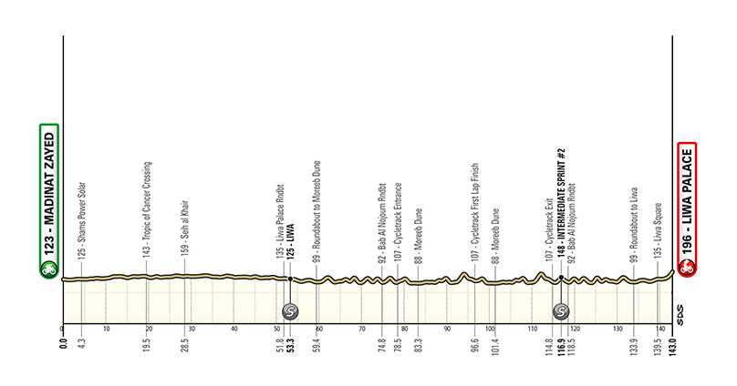 La etapa del desierto. Primera parte (dirección norte-sur) de unos 45 km por carreteras anchas y rectas. Tras llegar a Liwa, la carrera se adentrará en una zona de dunas muy pronunciadas, que conforman el grueso de la etapa. Una serie de subidas y bajadas conducen a Moreeb Dune, donde la carrera dará dos vueltas al carril bici de Moreeb Dune (18,1 km por vuelta) caracterizado por subidas y bajadas bastante pronunciadas con pendientes de dos dígitos. Luego regresa a Liwa para el final. La etapa transcurre por carreteras anchas, rectas y con buen asfalto.