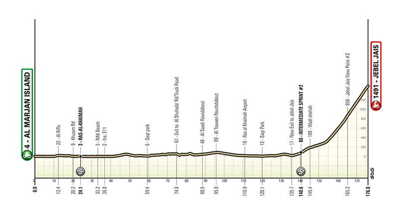 La primera de las dos etapas de montaña del UAE Tour. El escenario se divide en dos partes bien diferenciadas. El primero se acerca a la montaña final ondulando a través del desierto, mientras que el último se caracteriza por aproximadamente 20 km de ascenso continuo hasta la meta. Salida desde la isla de Al Marjan para llegar a Ras al Khaimah y regreso al desierto. Después del aeropuerto de Ras al Khaimah, la carrera se dirigirá directamente a la montaña Jais. La subida final de aproximadamente 20 km con una pendiente constante del 5%, con pendientes ligeramente más altas en torno al 7% en los últimos 2 km.