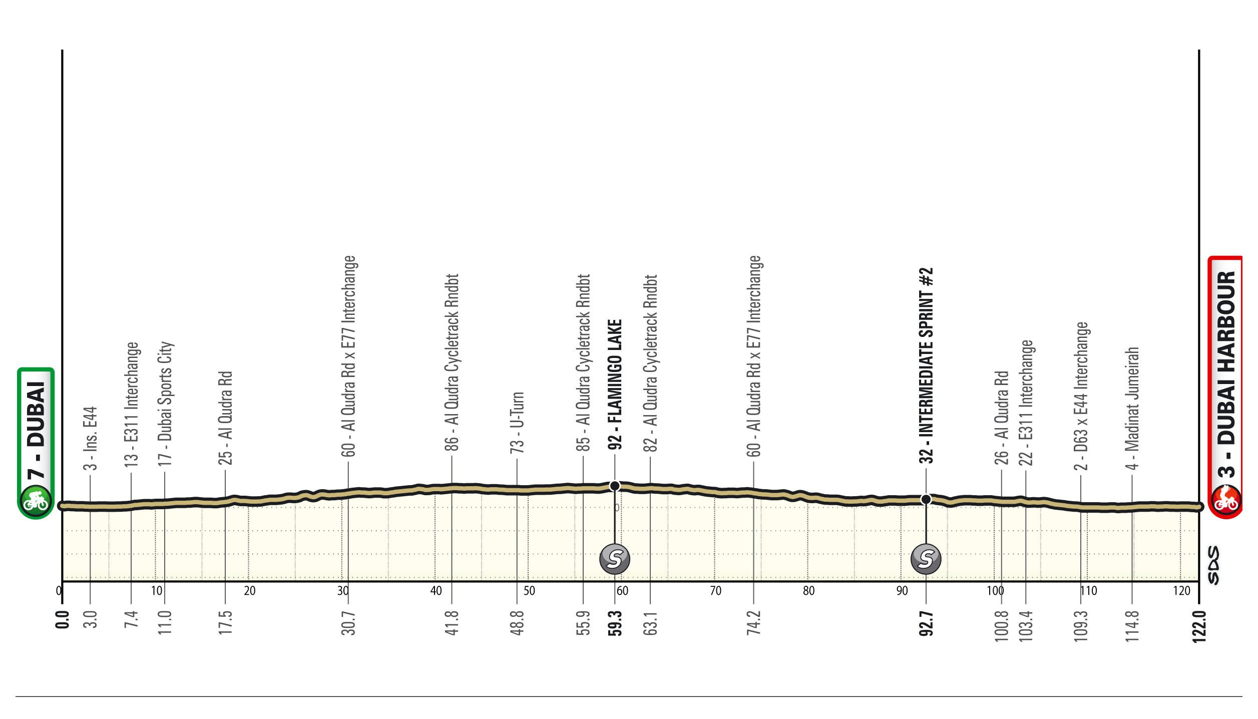 Una etapa en Dubai. Con salida en Dubai Miracle Garden, la carrera pasará por los lugares clásicos de estas etapas, como Dubai Sports City, Al Qudra Cycle Track y Dubai Global Village, para terminar en el puerto de Dubai. Todo el recorrido serpentea por carreteras muy anchas y sustancialmente rectas, intercaladas con rotondas de gran radio y bien pavimentadas.