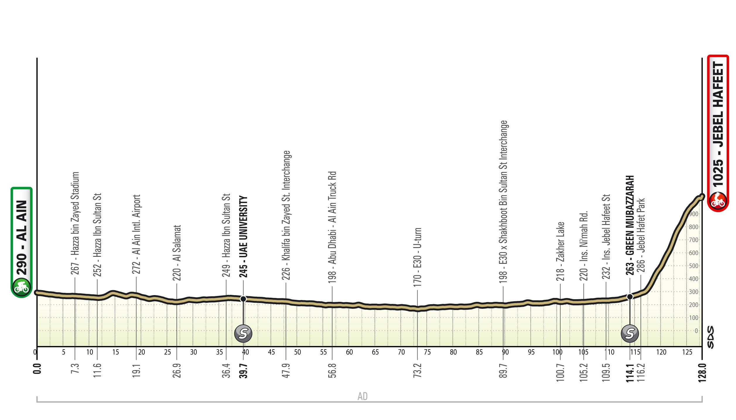 La clásica etapa de montaña del UAE Tour. En la primera parte, la ruta serpentea por Al Ain, donde se visitan muchos de sus lugares emblemáticos (Estadio Hazza bin Zayed, Universidad de los EAU), y luego da una larga vuelta por el desierto a lo largo de la Truck Road E30 hasta regresar a Green Mubazzarah. Aquí comienza la subida final a Jebel Hafeet, que con su tramo de 10 km será el juez final de la carrera.