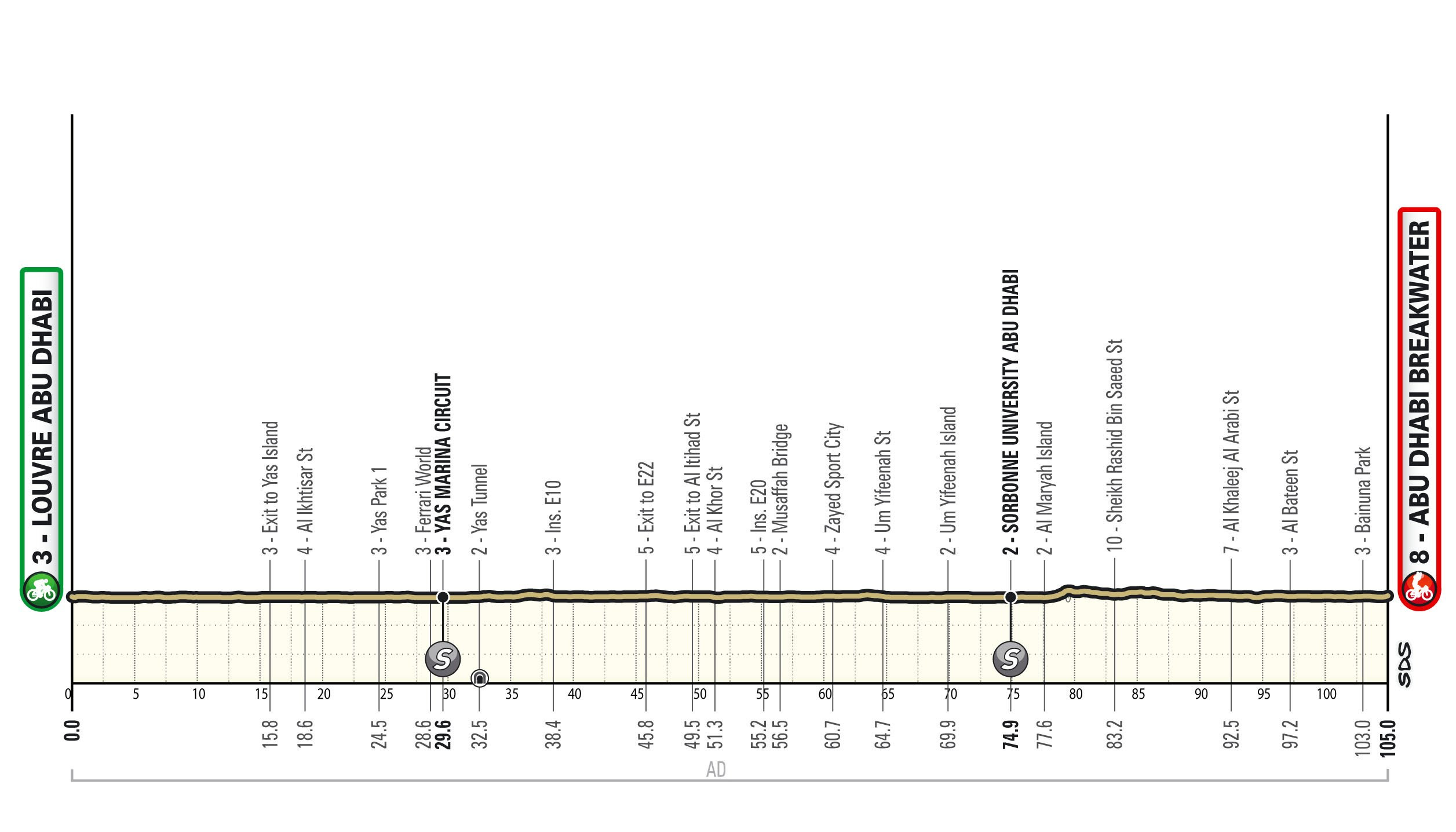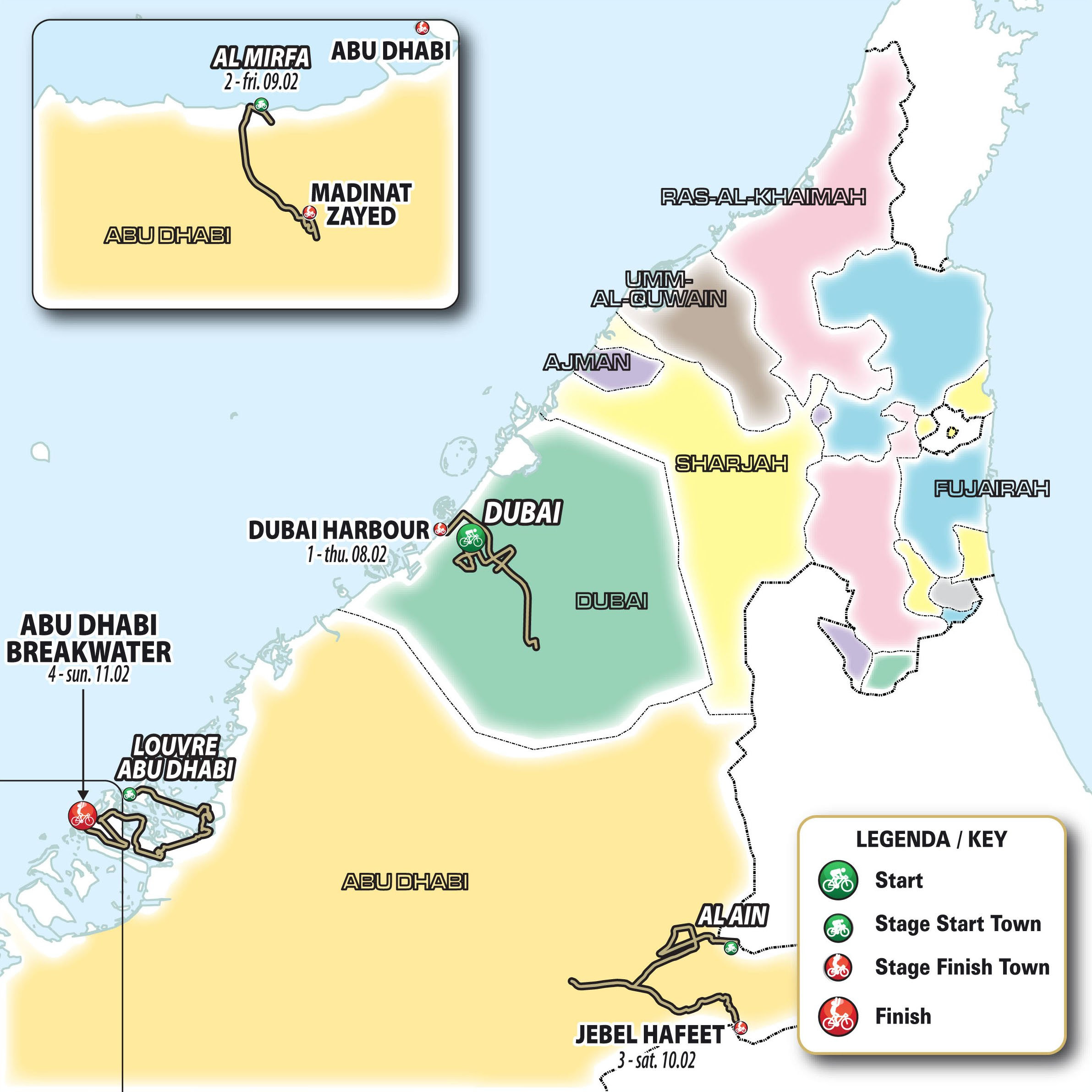Etapa alrededor de la ciudad de Abu Dhabi. Partiendo del Louvre Abu Dhabi, la primera parte del recorrido se dirige a la isla Saadiyat y luego a Yas Marina. Regresa a la ciudad de Abu Dhabi y pasa por la isla de Al Reem (Universidad de la Sorbona de Abu Dhabi) y la isla de Al Maryah. A continuación pasa por Qasr Al Hosn y llega al rompeolas de Abu Dhabi para una llegada al sprint.