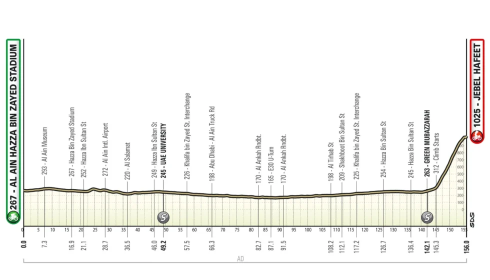 La clásica etapa de montaña del UAE Tour. En la primera parte, la ruta serpentea por Al Ain, donde se visitan muchos de sus lugares emblemáticos, como la Universidad de los EAU. Luego, realiza un largo recorrido por el desierto por la Truck Road E30 y finalmente regresa a Green Mubazzarah. Aquí comienza la subida final a Jebel Hafeet, que, con sus 10 km de longitud, será el veredicto final de la carrera. Las pendientes rondan principalmente el 8-9%, con un máximo del 11% a 3 km de meta.