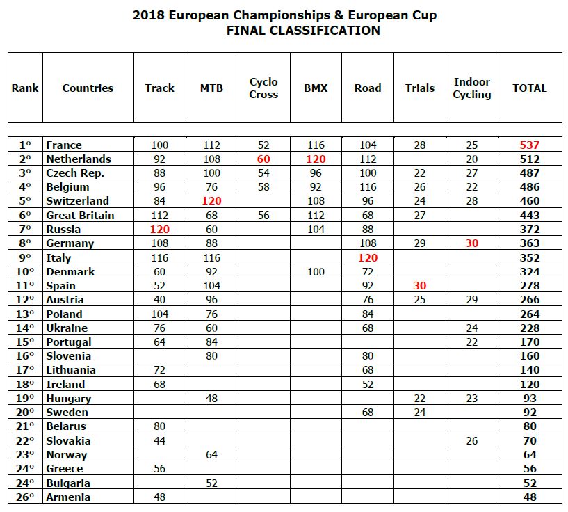Y es que el máximo organismo ciclista continental ha elaborado este ranking teniendo en cuenta los resultados obtenidos en los Europeos de las siete disciplinas que lo han tenido en 2018 –algunas con más de uno, según las distintas disciplinas o categorías que engloban-, en concreto pista, BTT, ciclocross, BMX, carretera, trial y ciclismo indoor, con un baremo de puntuación que cambia, siendo el máximo para las cuatro disciplinas olímpicas, intermedio para el ciclopedestrismo y el menor para las otras dos. El neonato Freestyle no ha vivido este evento.