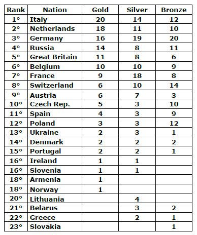 Esta clasificación se completa con otra tabla de medallas –lo que gusta bastante a los poderes públicos-, en la que Italia es ahora la que domina, con 20 oros, 14 platas, y 12 bronces, por delante de Países Bajos y Alemania, con Francia descendiendo a la séptima posición.