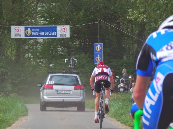 Vamos superando tramos –que están numerados en orden decreciente, como las curvas de Alpe d’Huez-, cada vez con más aficionados, sobre todos los catalogados con cuatro o cinco estrellas, pero con menos ciclistas. Fernando Barceló rompe la cadena y se cae, en la primera de sus múltiples desventuras; Ángel Fuentes también sufre otro percance y la llamada desde radio vuelta nos permite seguir un tramo de pavés desde detrás del coche del presidente del Jurado, en una experiencia que jamás olvidaré; Alfonso Gutiérrez -el chaval que descubrió el deporte de su padre cuando se entrenaba para ser futbolista, dejando de manera definitiva el balón por la bici- también lo pasa mal. Lo mismo que el nervioso Xavier Cañellas, que sufre varios pinchazos.