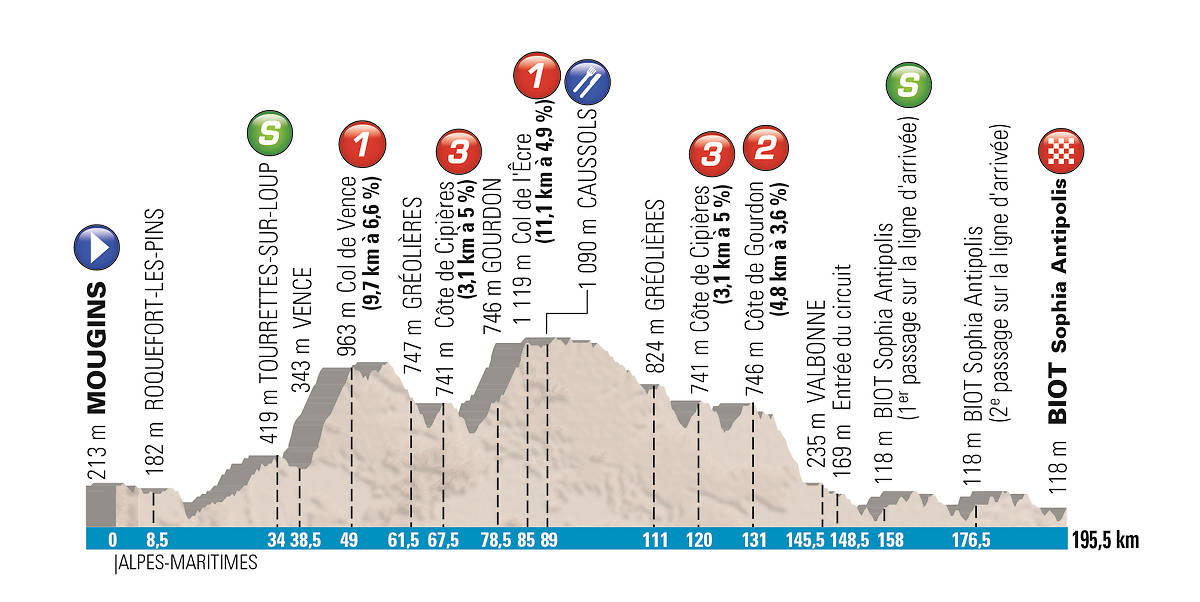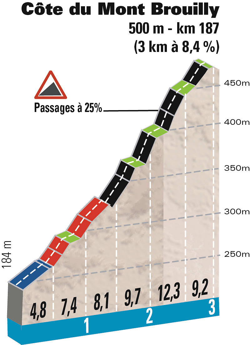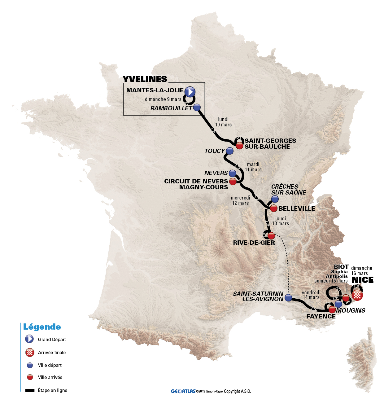 No obstante se subirá al Mont Brouilly (con rampas al 25 %), o al clásico Col d’Eze, último puerto antes de llegar a Niza. Otro de los alicentes del trazado es la meta el circuito automovilístico de Magny-Cours en la tercera jornada.