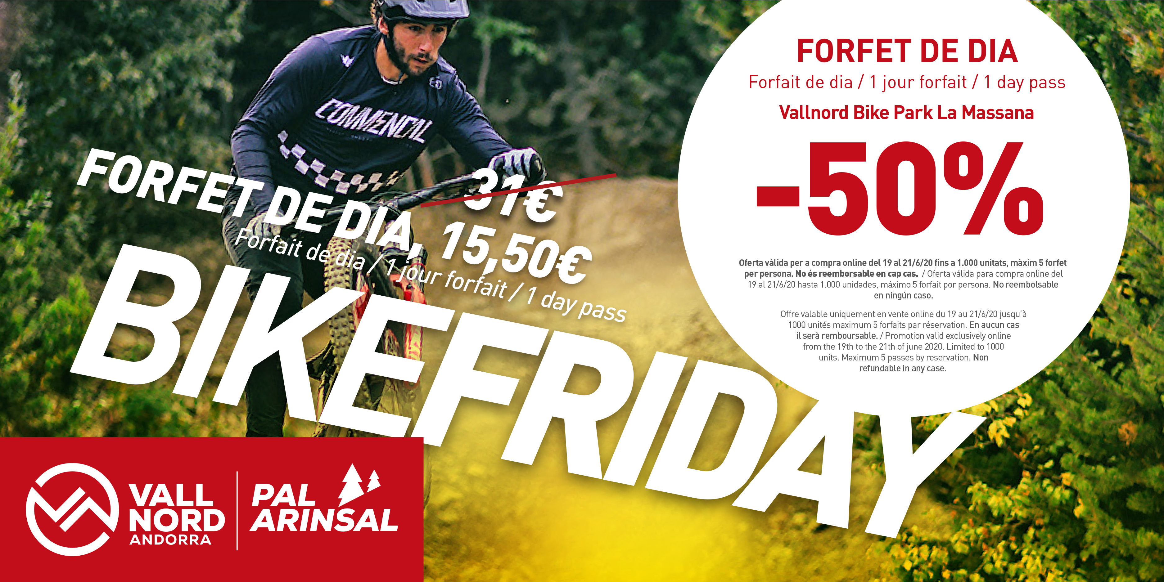 A partir del viernes 19 de junio y hasta el domingo 21 de junio o hasta agotar existencias, Vallnord-Pal Arinsal activará la tecera edición de la versión de verano del Black Friday. Serán tres días en el que todos los usuarios podrán adquirir el forfait de adulto o de niño de un día para Vallnord Bike Park la Massana con una reducción en el precio del 50%.