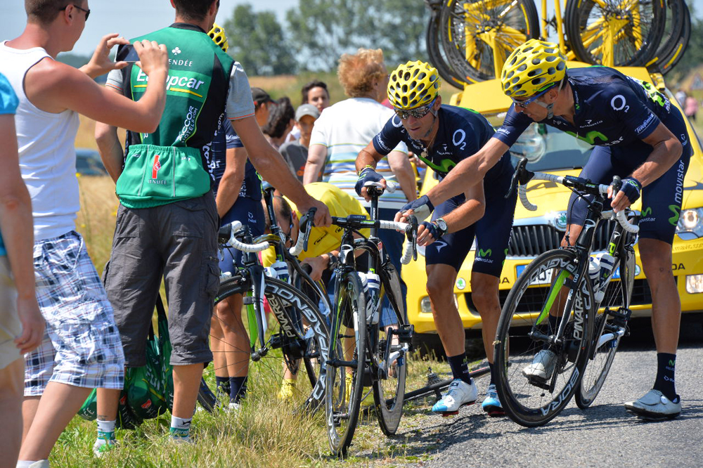 El infortunio se ha cebado por completo con Movistar Team en la 13ª etapa del Tour de Francia 2013, una jornada que se presumía intrascendente para el resultado final de la carrera. Los 173 kilómetros llanos entre Tours y Saint-Amand-Montrond han acabado deparando un sinfín de movimientos a causa del viento de costado en una cabeza de carrera en la que, como durante todo el Tour, siempre rodaron los ocho ciclistas de Movistar Team. La escuadra telefónica pasaba al completo una primera selección de unos noventa hombres tras un tirón propiciado por Omega pero, al paso por el avituallamiento, un frenazo propiciaba la rotura de la rueda trasera de Alejandro Valverde tras ser embestido por detrás por otro corredor. Rápidamente auxiliado por cuatro compañeros de equipo, entre los que Jonathan Castroviejo le cedía su rueda, Valverde iniciaba una frenética persecución con más de medio minuto de retraso.