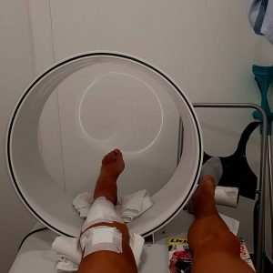 «Poco a poco» es su resumen mientras flexiona ya treinta grados su fractuarada articulación que deberá ser intervenida en cinco meses para retirarle los tornillos y clavos que fijan ahora su rodilla izquierda.