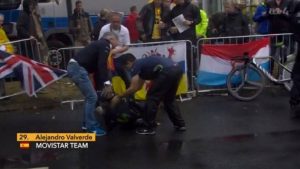 Valverde ha explicado en Eurosport que por la mañana entrenó por la zona y pasó hasta cuatro veces por esa misma curva, «con la carretera mojada». También lo hizo en coche «siguiendo a Betancur», y tiene claro que «seguro» que había «algo de aceite ahí»: «Yo entré rápido porque tienes que ir al límite siempre sabiendo que no quieres caerte. Estaba ya casi saliendo y patinaba más en el suelo que más rápido iba en la bici». Está convencido que el efecto que sufrió «con un asfalto limpio no pasa, y menos en esa zona de Alemania que está todo el día lloviendo». El murcianco recordó, además, que en ese punto «se había caído una moto, a partir de ahí empezó a haber caídas».