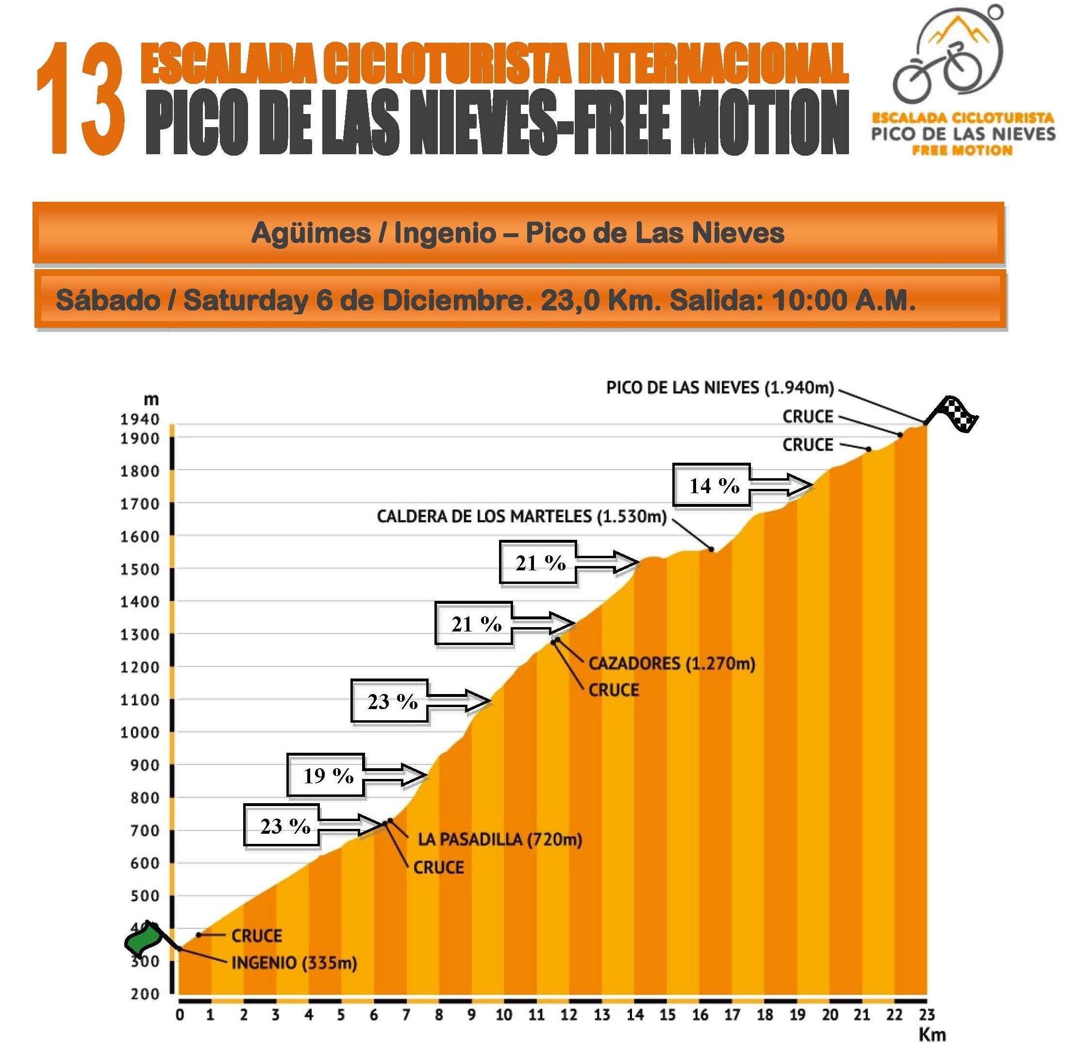 Mañana se disputará la 13ª Escalada al Pico de Las Nieves-Free Motion, considerado como el puerto más duro de Europa, que presenta una novedad de última hora: La salida estará ubicada en La Plaza de Candelaria en Ingenio y no en Agüimes como inicialmente estaba previsto En esta Plaza de Candelaria tendrá lugar el control de firmas y el protocolario corte de cinta. La salida está previsto tenga lugar a las 10:00 de la mañana. Los cicloturistas tendrán un margen de 4 horas para realizar la Escalada. A las 14:00 se cerrará el control. A lo largo de las 12 ediciones disputadas nunca se ha dado que un corredor entre fuera de control.
