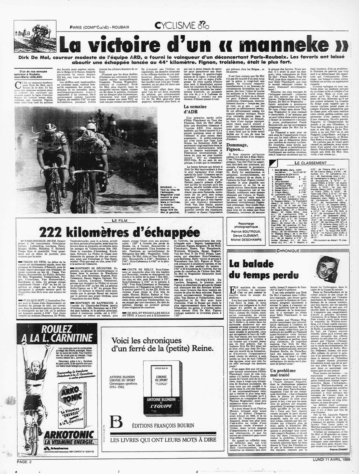 Ese año su equipo, AD Renting, tenía un gran favorito: Eddy Planckaert. Tenían rivales estelares: Sean Kelly, Laurent Fignon, Marc Madiot, Eric Vanderaerden… Pero fue el «manneke» («pequeño») Demol, procedente de Kuurne, a unos 25 km de Roubaix, quien logró un triunfo inesperado, superando a sus compañeros de fuga. «Los números no perdonan», escribió Jean-Marie Leblanc de camino a Kuurne, mientras reflexionaba para L’Équipe sobre la imposibilidad matemática de Fignon de superar una diferencia de 2’52» en los últimos kilómetros. El francés finalmente cruzó la línea de meta en 3ª posición, 1’55» detrás de Demol. Fignon nunca acertó con los números en Roubaix, mientras que Leblanc dominó el monumento francés, así como el Tour de Francia. En cuanto a Demol, ahora comparte sus conocimientos únicos como director deportivo del Lotto Dstny después de trabajar con íconos como Tom Boonen y Fabian Cancellara.