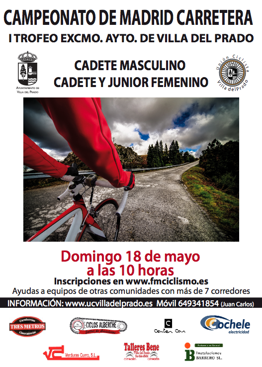 El próximo domingo 18 de mayo se celebrará el Campeonato de la Comunidad de Madrid de carretera para las categorías cadetes masculino y féminas cadetes-júnior. La sede será en la localidad del suroeste de Madrid de Villa del Prado sobre un circuito duro y exigente que seleccionará a los mejores ciclistas madrileños de esta temporada 2014. Estará organizado por la UC Villa del Prado y la Federación Madrileña de Ciclismo, con la colaboración del Ayuntamiento de Villa del Prado.
