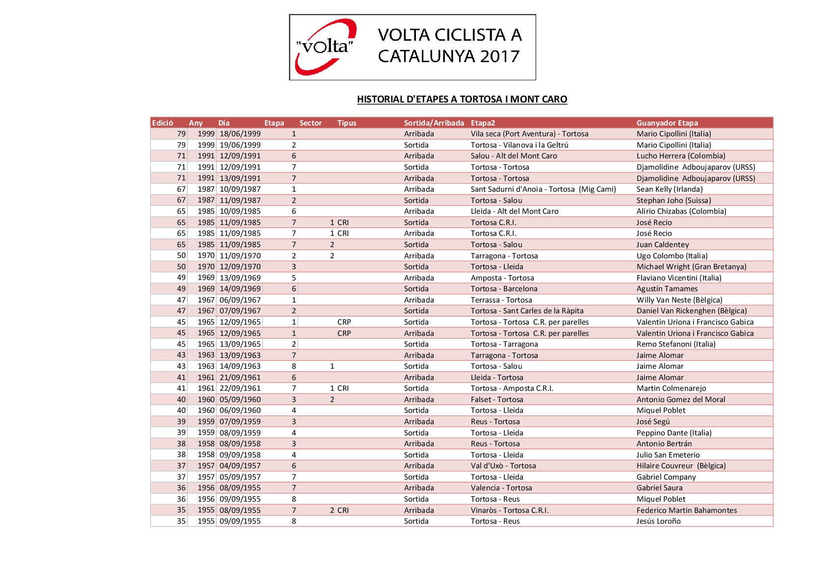 El sábado 25 Tortosa acogerá la salida de la 6ª etapa y se añade nuevamente después de 18 ediciones en el itinerario de la «Volta» por 33ª ocasión.
