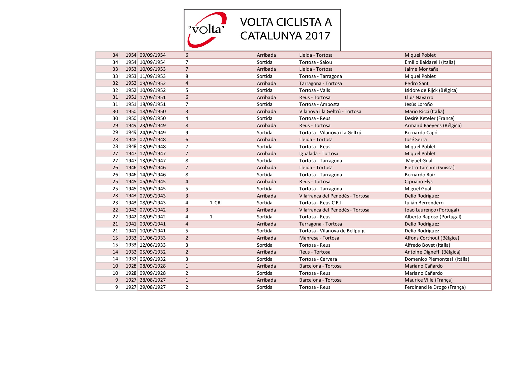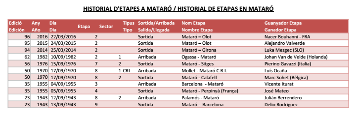 Mataró -que ha acogido tres llegadas de la Volta los años 1943 -1955 – 1970 y 1982 con victorias de J. Berrendero, V. Iturat, L. Ocaña y Johan Van de Velde- ha formado parte del itinerario en las ediciones 2014-15 y 16 sólo como salida de etapa.
