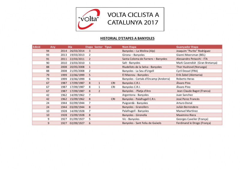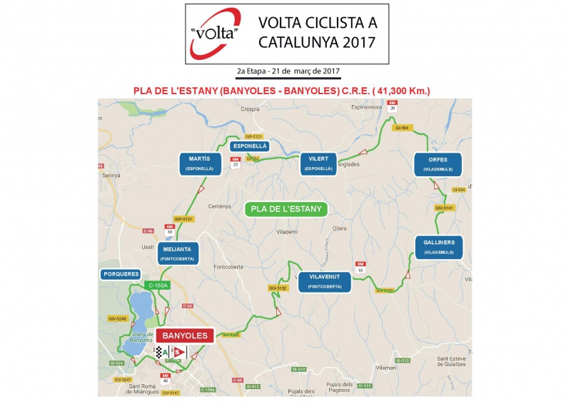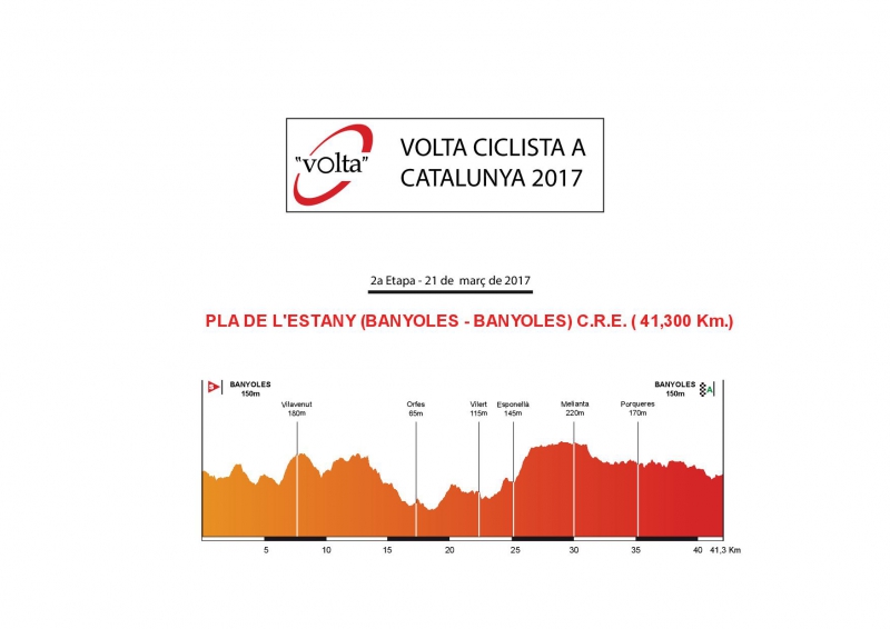 En la sede del Ayuntamiento de Banyoles se ha presentado de la que será la 2ª etapa de la 97ª Volta Ciclista a Catalunya; una contrarreloj por equipos de 41.300 km -distancia similar a la del pasado Mundial- que tendrá lugar por la comarca del Pla de L’Estany el martes 21 de marzo de 2017 con salida y llegada en Banyoles.