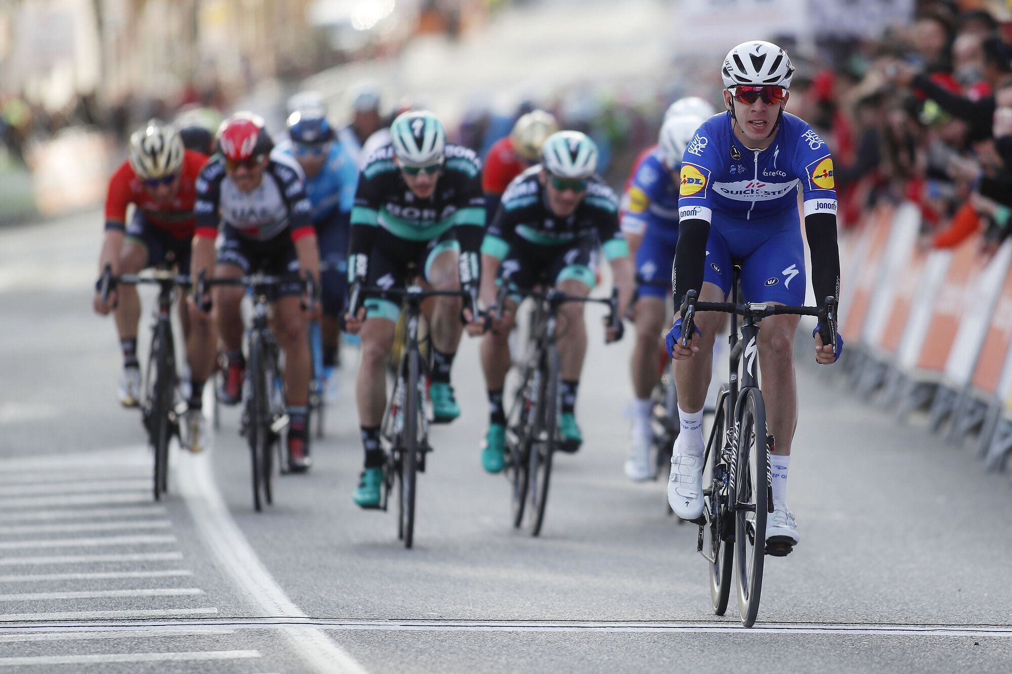 La pareja del Bora alemán Sam Bennett y Jay McCarthy vieron en primera persona como el joven de 21 años se alzaba con su primera victoria en el UCI World Tour supliendo de manera notable la ausencia de su amigo y compañero lesionado -fractura de mano- Fernando Gaviria , y reforzando el poderío del grupo de Lefevere en esta primera parte de la campaña con su versátil plantilla.