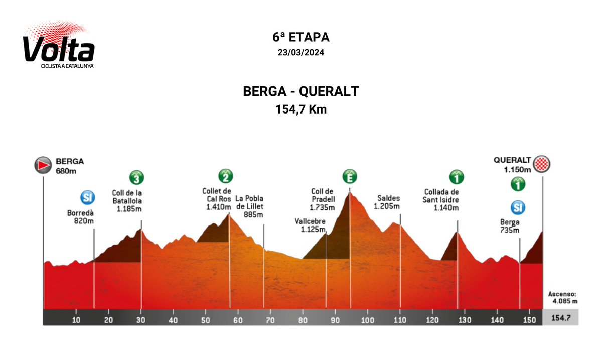 Todo estará preparado para vivir en la sexta etapa una de las etapas más esperadas y que se esperan más decisivas: una jornada sin descanso de 154,7 kilómetros con salida desde la ciudad de Berga, que no era protagonista de la Volta desde 1959, y llegada en altura en el santuario de Queralt, que descubrirá todo el potencial ciclista del Berguedà. Será una etapa de verdadera montaña con cinco puertos puntuables, entre los que destacará el estreno en competición del Coll de Pradell, de categoría especial, temido por su longitud y sus rampas imposibles.