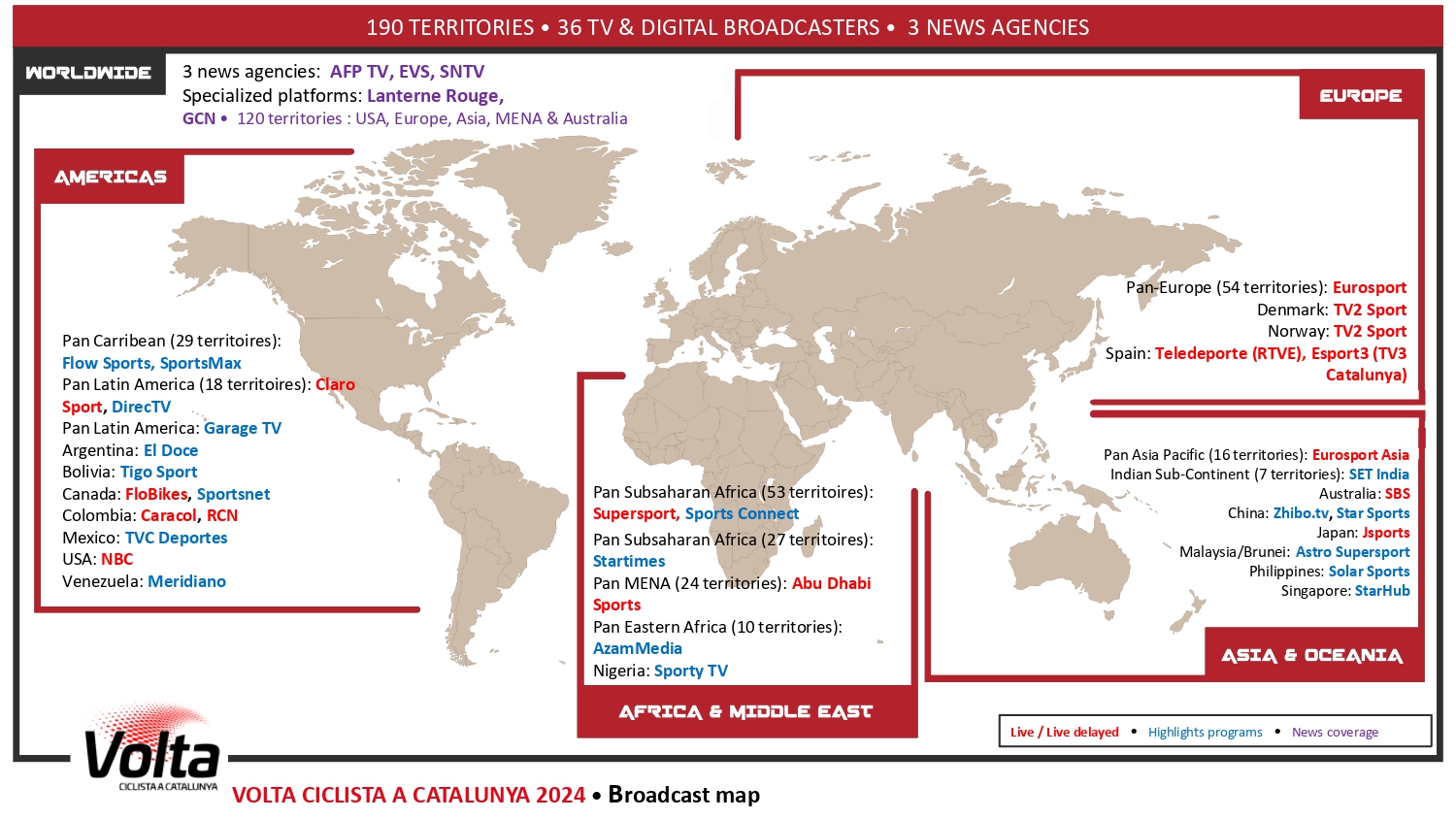 Así pues, todos los ingredientes están preparados para vivir una 103 edición histórica de la Volta a Catalunya, que volverá a reunir durante una semana a los mejores ciclistas del mundo por las carreteras catalanas. Un espectáculo deportivo y unas imágenes del territorio que llegarán a todo el mundo gracias a la importante difusión internacional de la prueba catalana, la tercera más antigua de la élite mundial después del Tour de Francia y el Giro de Italia, que distribuye sus imágenes en 190 países a través de 36 difusores internacionales y que se podrá seguir en directo por televisión en España a través de Esport 3, Teledeporte y Eurosport.