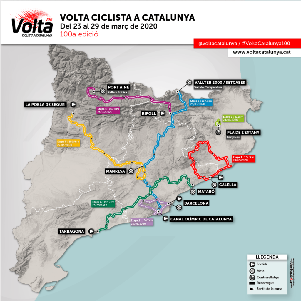 La Volta a Catalunya cumplirá su 100º aniversario. La primera prueba World Tour del calendario español se disputará entre los días 23 y 29 de marzo de 2020 yarrancará con una etapa en línea con principio y final en Calella.