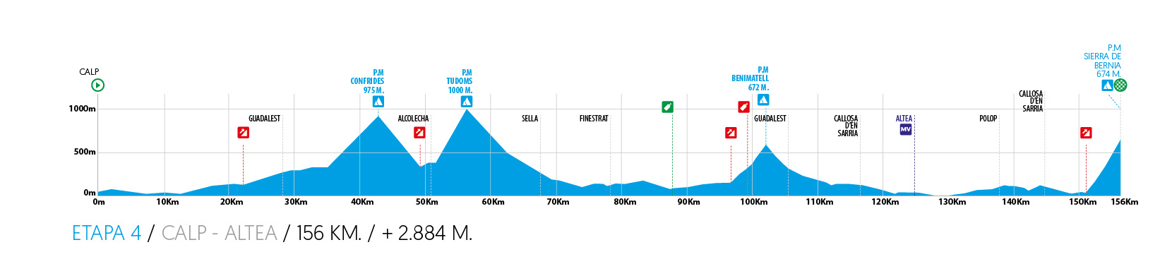 Antes la carrera vivirá su momento decisivo en el final de Bernia, un terrible puerto de 5 kilómetros que se inicia en la localidad de Altea. En esa distancia se salva un desnivel de más de 600 metros con una pendiente media del 11,2% y picos máximos del 24%. Una etapa corta, de 156 kilómetros, con 5 puertos de montaña, será la etapa reina, con bastante desnivel y decidirá el vencedor de esta Vuelta CV.