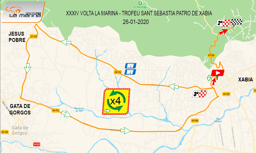 La salida está prevista a las 10 de la mañana en la Plaza de la Constitución de la localidad alicantina. El recorrido programado consistirá en dar cuatro vueltas a un circuito de 17 kilómetros, Xàbia-Jesús Pobre-Gata de Gorgos-Xàbia, hasta completar los 68,3 kilómetros. La Ermita será el paso intermedio en las vueltas número dos y tres, donde estarán ubicadas las metas volantes; y la meta final será en el alto del Montgó (premio de la montaña) y estará ubicada frente al restaurante Amanecer, donde se prevé que los corredores finalicen la prueba sobre las 11.50 horas.