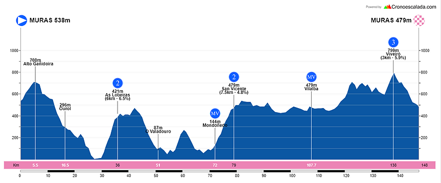 La tercera jornada de esta Volta Ciclista Galicia llevará a los corredores a la provincia de Lugo. Con salida y llegada a Muras, están previstos 149 kilómetros que presentan dos ascensos de 2ª categoría en la primera mitad del recorrido y el ascenso final a Viveiró (3km al 6%) a tan solo 10 kilómetros de meta.