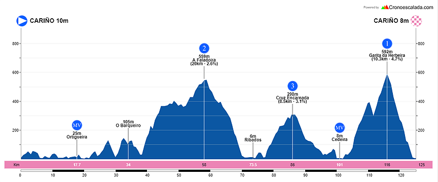 La Vuelta a Galicia se cierra este domingo en Cariño (A Coruña) con una cuarta etapa que está destinada a ser decisiva. 125 kilómetros que incluyen tres colosos: A Faladoira (km 58), Cruz Encarnada (km 86) y Garita de Herbeira, con sus últimos 5 kilómetros por encima del 7% y un pico de 9 kilómetros de meta, que llevará a los corredores a un retorcido y descenso técnico final.