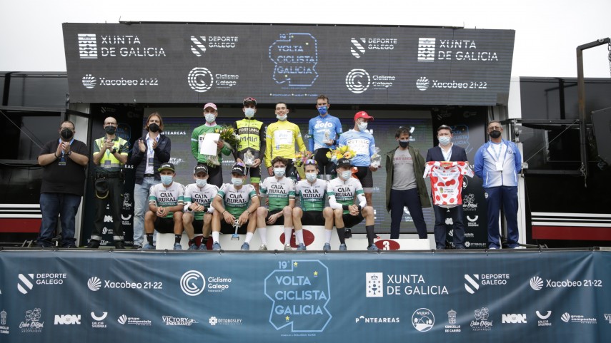 En el podio, Marc Brustenga se llevó casi todos los premios y maillots de líder: la general, la regularidad y el primer sub-23. El mejor equipo fue el EOLO Kometa y el primer gallego Rubén Fernández (Aluminios ALCA). El viernes la localidad de Ponteareas acogerá la segunda etapa y primer día en la línea de carrera. Serán 143 kilómetros que incluyen las Metas Voladoras de O Porriño y Ponteareas (primer paso por meta), las subidas a Cañiza y A Franqueira (3ª categoría) en la segunda mitad de etapa y un doble circuito final de 16 kilómetros, con pasos individuales por meta y ascensos a Vilasobroso (2,2 km al 7,5%), el último de ellos a menos de 7 kilómetros de la llegada.