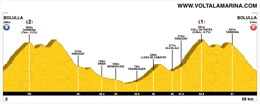 En esta quinta prueba el pelotón correrá un total de 67 km. La hora de salida prevista es a las 10:00h y tan solo a pocos kilómetros del inicio de la prueba los ciclistas subirán los 7 km del alto de Tàrbena, de segunda categoría, donde a buen seguro se seleccionará la carrera. Después de recorrer Parcent, Orba, Benidoleig, Pedreguer, Llosa de Camatxo, Alcalalí y nuevamente Parcent, se subirá el alto de Coll de Rates, de primera categoría. Los últimos 14 kilómetros serán de descenso hasta Bolulla.