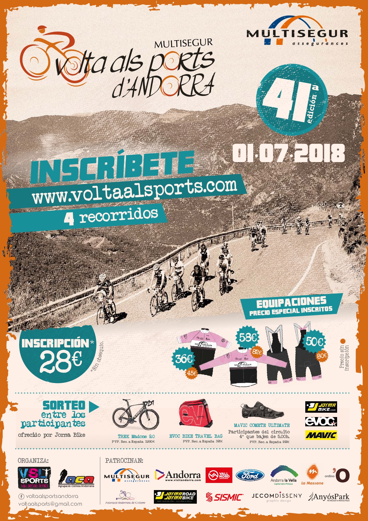 La Multisegur Volta als Ports d’Andorra, la marcha cicloturista con más tradición del país, llega este año a su 41ª edición este domingo 1 de julio, ofreciendo cuatro itinerarios a los participantes. De ellos, el más largo transcurrirá sobre un trazado de 111 kilómetros y contará con 3.840 metros de desnivel acumulado. El primer recorrido intermedio contará con 80 kilómetros y 2.245 metros de desnivel acumulado. Un poco menos exigente es el segundo recorrido intermedio, con 53 kilómetros y 1.873 metros de desnivel acumulado. Por último, el más corto de todos ellos tendrá 21 kilómetros con 800 metros de desnivel.