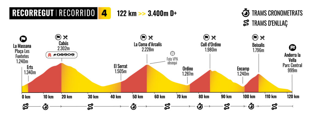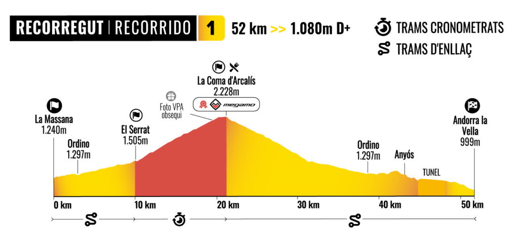 - El recorrido tendrá el tramo cronometrado desde Erts hasta el puerto de cabús,el Serrat hasta la Coma de Arcalis, del Pueblo de Ordino al Coll d’Ordino, del pueblo de Encamp a La Collada de Beixalis ..